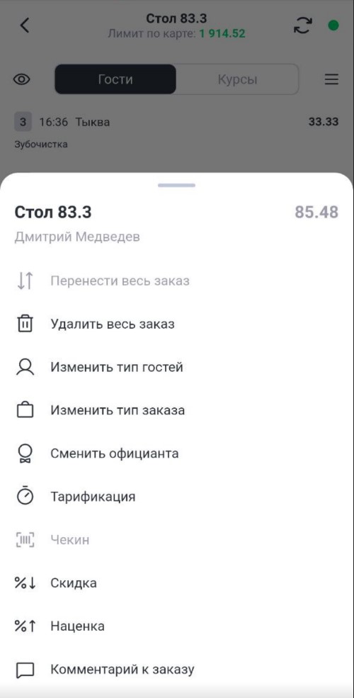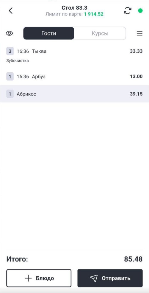 - Количество гостей не указывается. В режиме Карта на входе в заказе всегда 1 гость по умолчанию. Соответственно весь стандартный функционал работы с гостями в заказе отсутствует