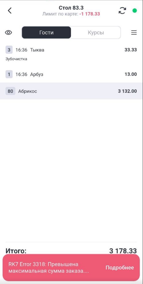 - В заказе отображается поле с суммой ограничения по визиту. Если добавляемое блюдо не превышает лимит, то сумма отображается зеленым шрифтом. Как только добавленные блюда превысят лимит, сумма будет отрицательной и отобразиться красным цветом.