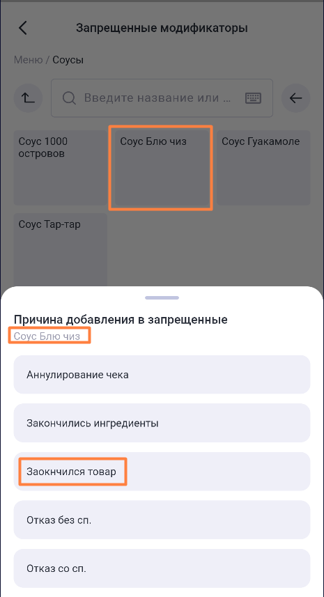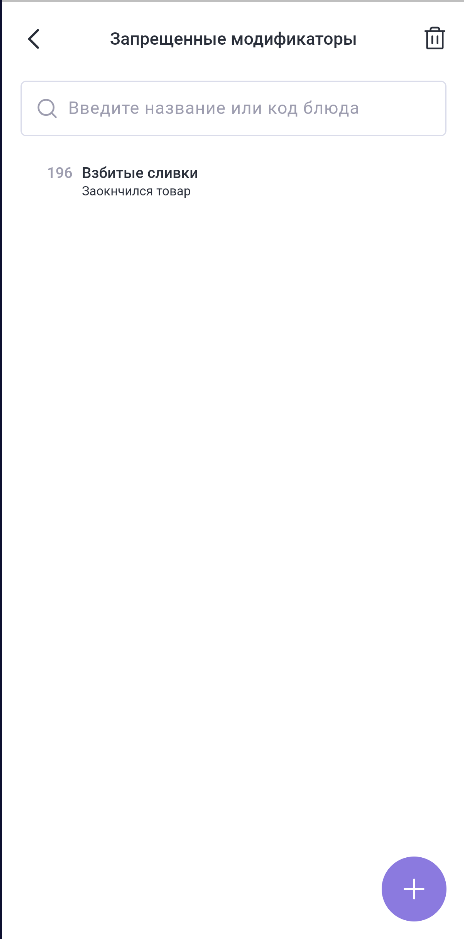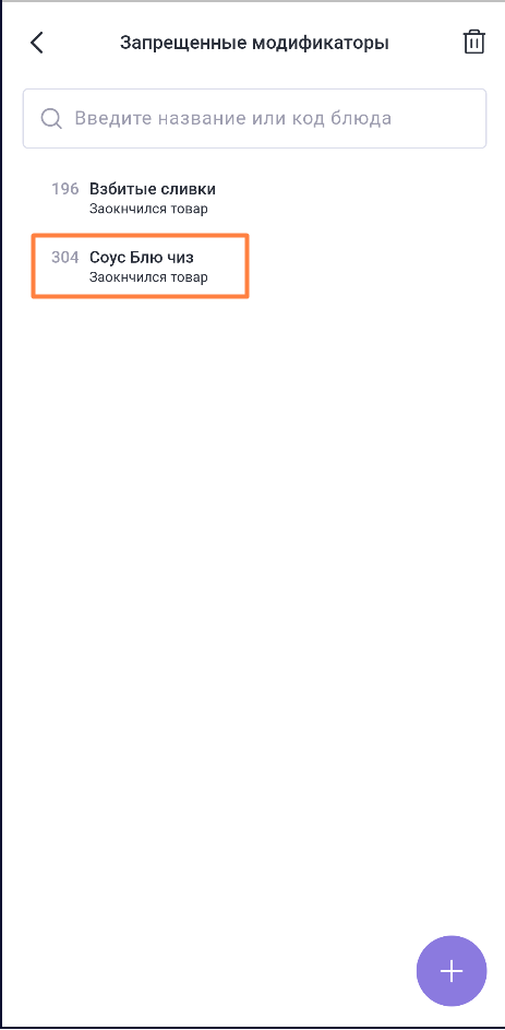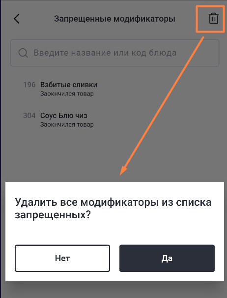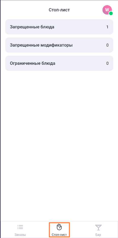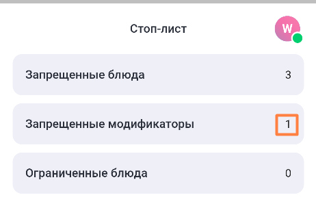 В строке с названием раздела Запрещенные модификаторы отображается количество модификаторов, поставленных в стоп-лист.