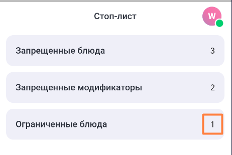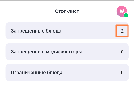 В строке с названием раздела Запрещенные блюда отображается количество блюд, поставленных в стоп-лист.