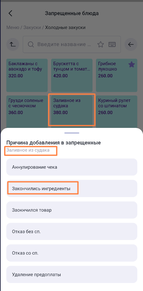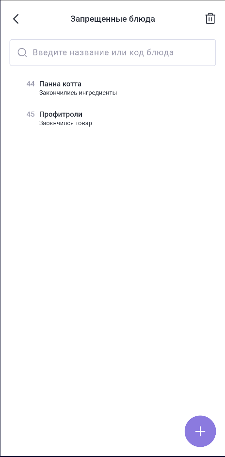 Для добавления блюда в запрещенные нажмите кнопку + и выберите причину (если она включена в настройках в менеджерском модуле). Блюдо добавится в список.