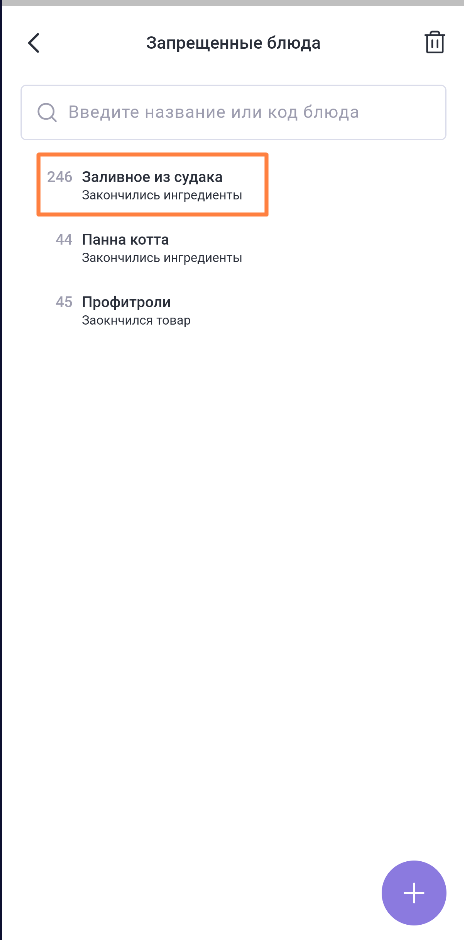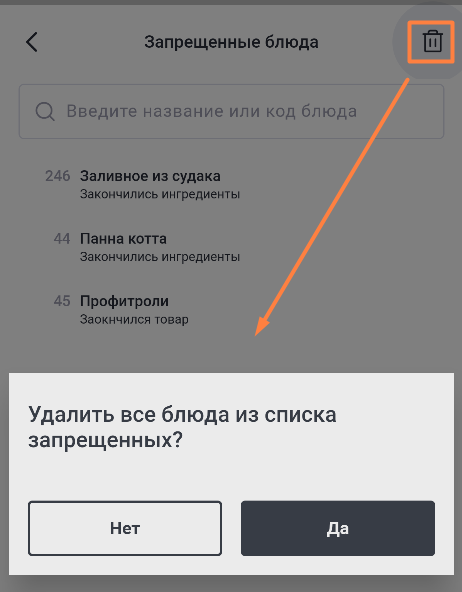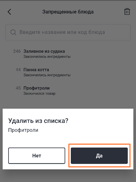 Чтобы вернуть блюдо в продажу, нажмите на него и удалите из списка.