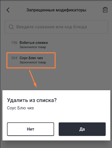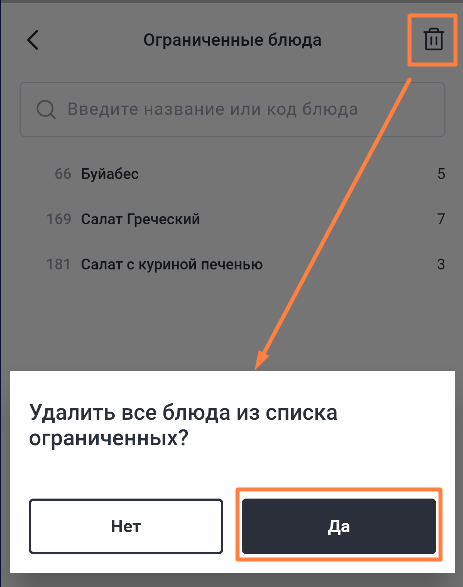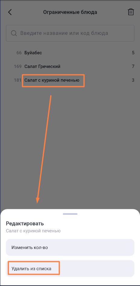 Чтобы снять ограничение продаж, нажмите на него и выберите Удалить из списка. Блюдо удалится из списка и станет доступно к продаже без ограничений.