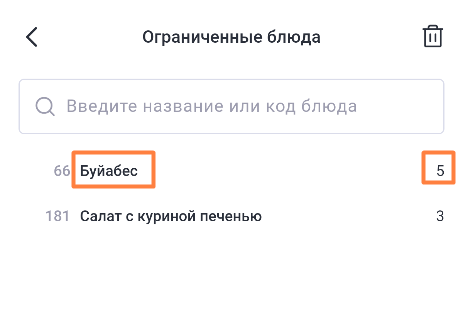 В строке с названием раздела Ограниченные блюда отображается количество блюд, ограниченных к продаже.