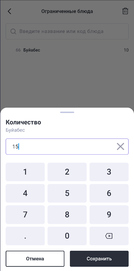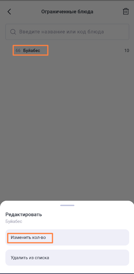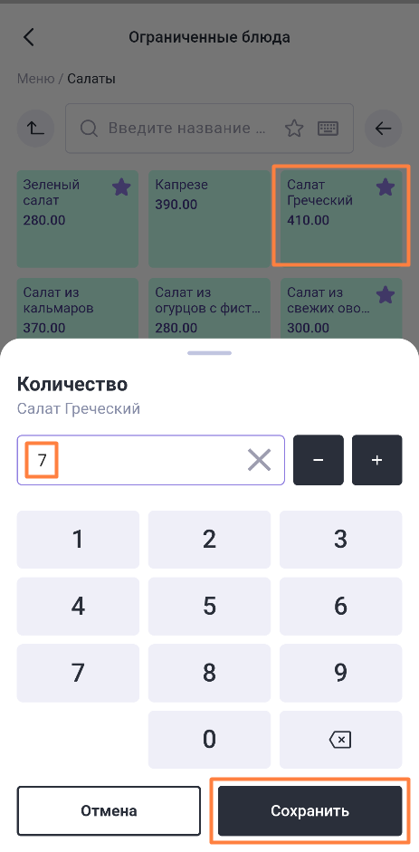 Чтобы изменить текущее ограничение для блюда, нажмите на него и выберите Изменить кол-во, введите новое количество и сохраните. Ограничение у блюда изменится.