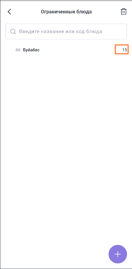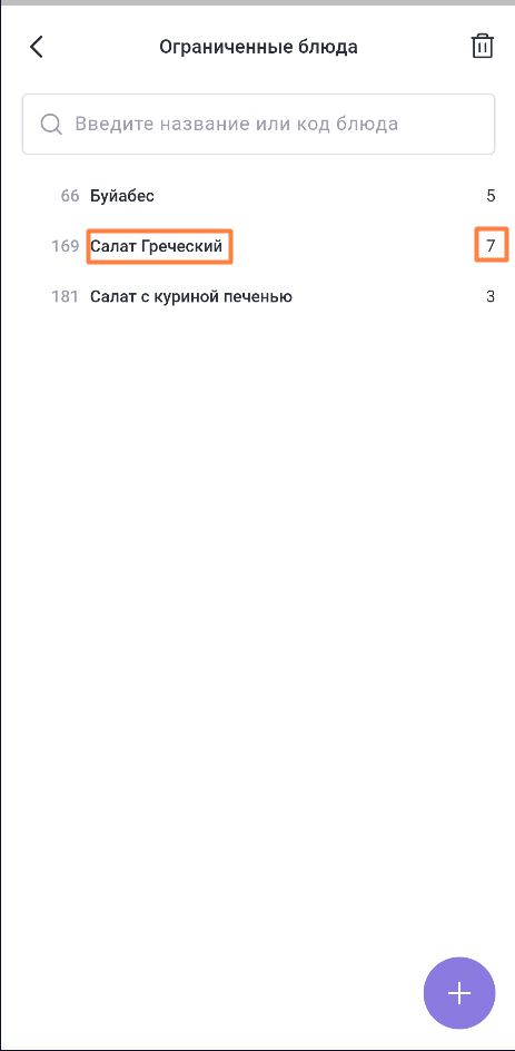 Для добавления блюда в список ограниченных нажмите кнопку + и установите количественное ограничение. Блюдо добавится в список.