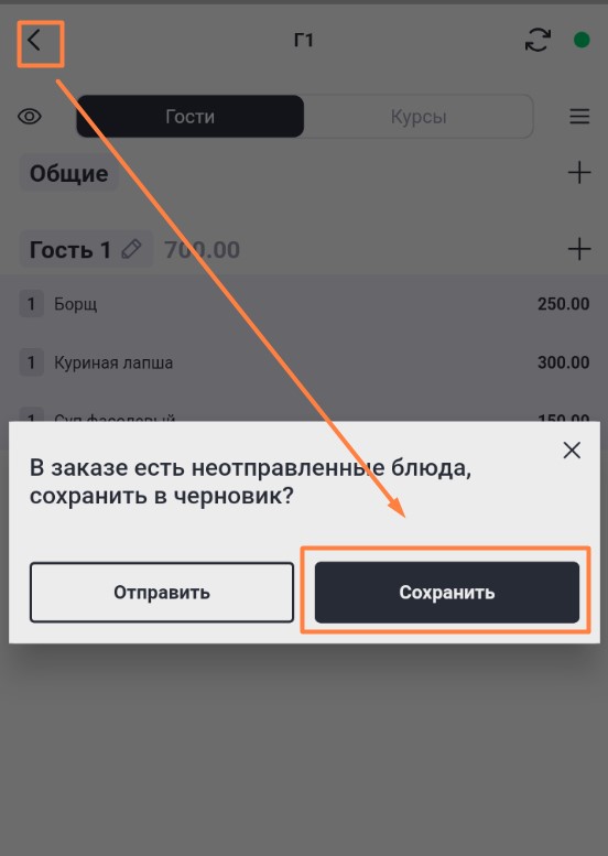 Если отправку блюд требуется сделать позже, можно сохранить заказ без отправки. Для этого нажмите кнопку выхода из заказа и выберите ответ Сохранить.