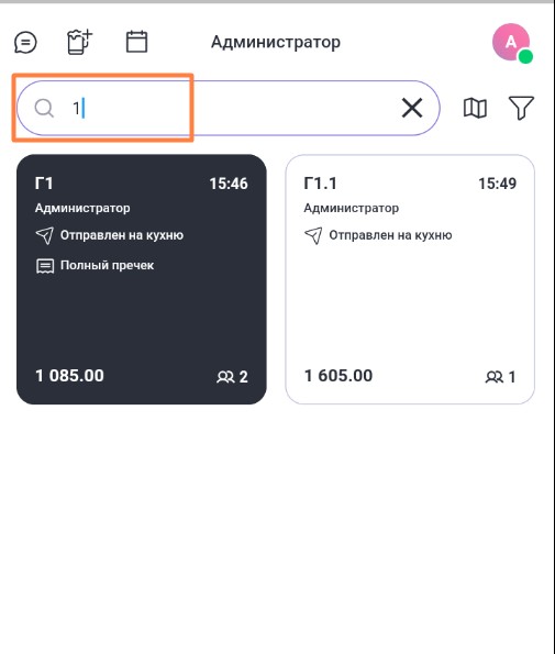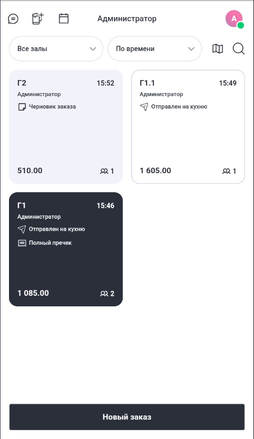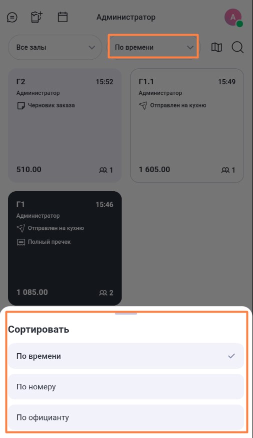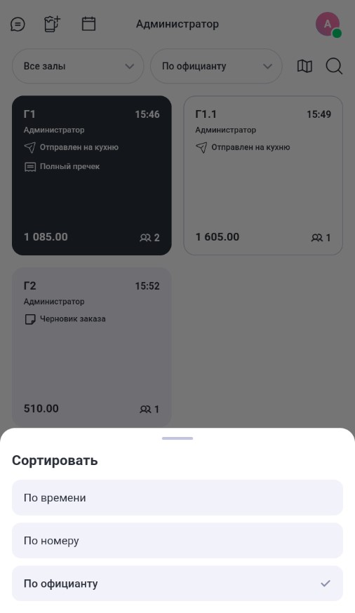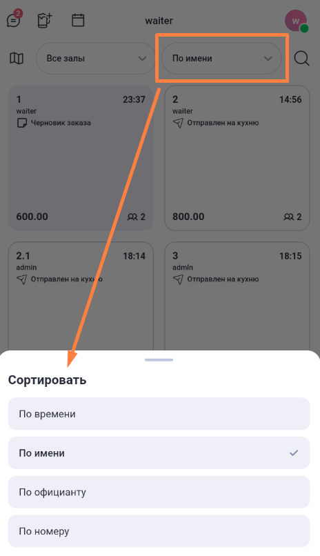 - По официанту. При выборе этого типа сортировки первыми в списке будут отображаться заказы текущего официанта, а затем заказы других официантов. Чужие заказы будут сгруппированы по официантам и отсортированы по имени официанта. Заказы каждого работника также будут отсортированы по номеру.