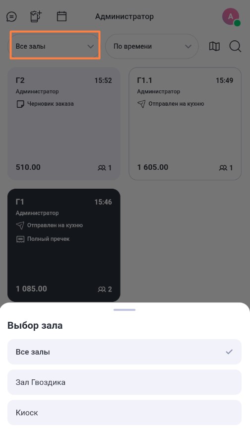 Также можно оставить на экране заказы только нужного зала.
