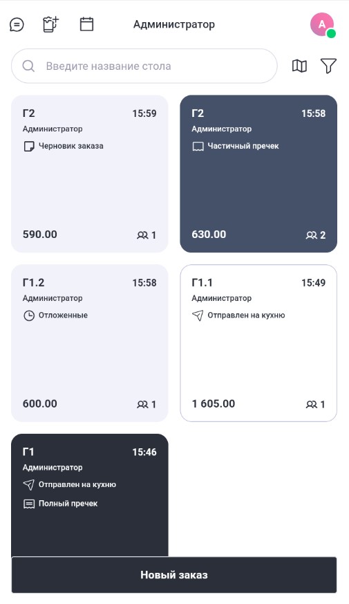- слева: имя стола и статусы в виде иконок, без названий