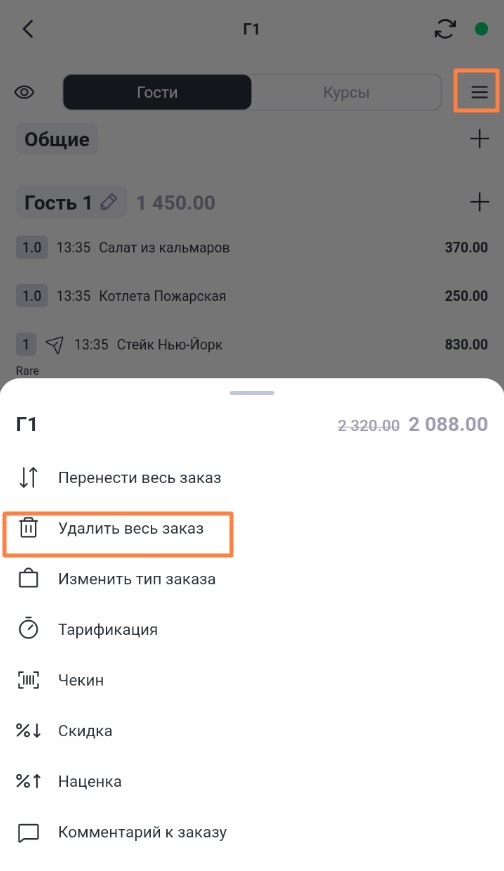 - Если в заказе есть отправленные блюда, выберите причину удаления и подтвердите операцию.