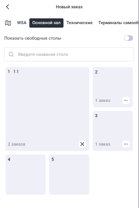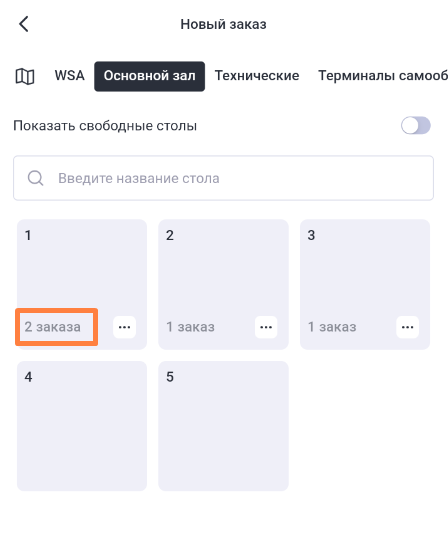 В списке столов Зала отобразятся все его столы и заказы. Если на столе есть открытые заказы, их названия списком отобразятся в строке с именем стола. Также у занятого стола отображается иконка гостей . Если при создании заказа выбрать стол, на котором уже создан заказ (т.е. стол уже занят), то при отправке заказа ему присвоится имя через точку. Например: 10.1. Включите опцию Показать свободные столы, чтобы оставить для выбора только незанятые столы.