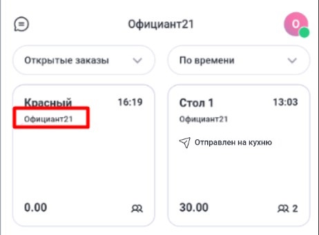 - Откройте заказ с официантом Система