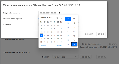 В случае если флаг Указать свое время отмечен , то открывается выбор даты и времени для обновления.