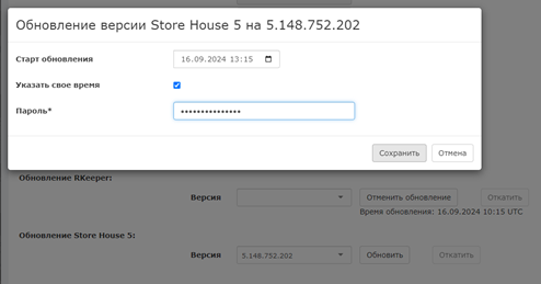 Если флаг Указать свое время не выбран или выбрано время ранее текущего времени пользователя, обновление выполняется в обычном режиме, т.е. сразу после нажатия на кнопку Обновить и подтверждения временных настроек в модальном окне по кнопке Сохранить.