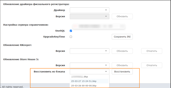 - При нажатии на сточку Восстановить из бэкапа в ниспадающем списке открывается выбор бэкапа, от самого свежего к самому старому. По умолчанию будет указан самый свежий бэкап.