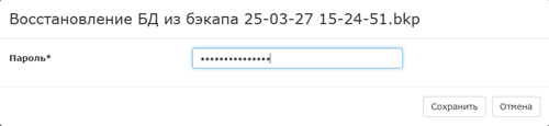 - После ввода корректного пароля происходит восстановление БД из выбранного бэкапа.