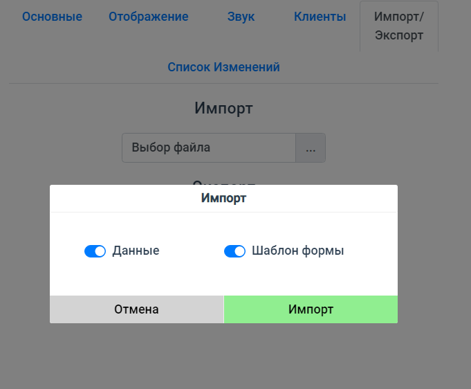 Для импорта настроек в окне Выбор файла выберите ранее экспортированный шаблон. Укажите настройки импорта и нажмите кнопку Импорт.