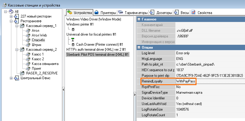 - В свойствах драйвера измените значение параметра RemindLoyalty на WithPayPass