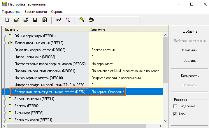 - В настройках параметров самого терминала TlvEdit.exe измените значение параметра Возвращать промежуточный код ответа (DF7D) на По картам Сбербанка: