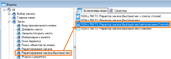 - В форме где будет использоваться функционал — здесь выбрана Редактирование заказа (быстрый чек) создайте копию предустановленного экземпляра формы, переименуйте ее и сохраните изменения