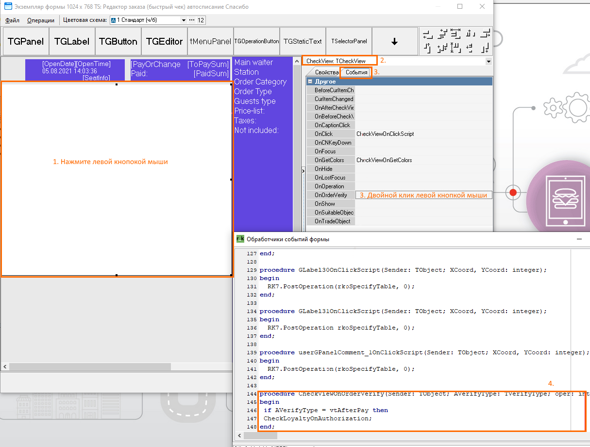 Откройте редактор формы, выделите компонент CheckView в строке OnOrderVerify добавьте скрипт: