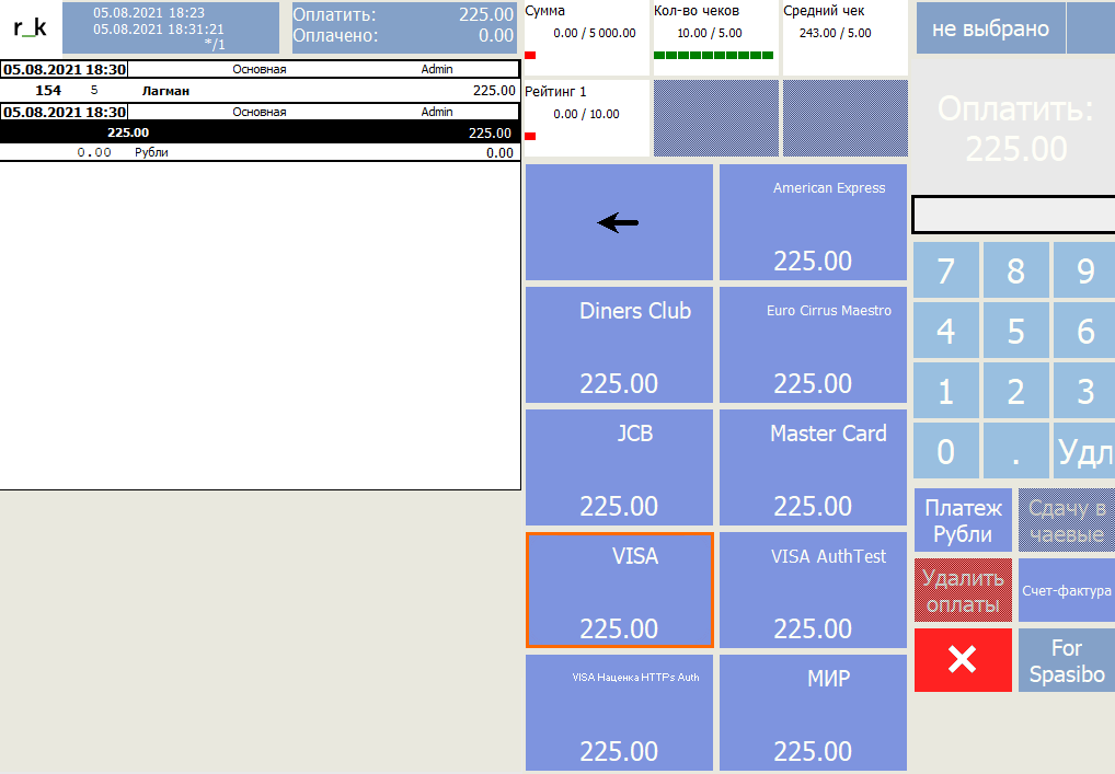 Если стоимость заказа меньше указанного в скрипте значение const minordersum = 250 — процесс расчета аналогичен классической оплате по банковской карте, при выборе формы чека с настроенной информацией о статусах в системе "Спасибо" можно наблюдать количество начисленных балов - Нажмите кнопку Оплатить Рубли > Кредитные карты > Валюта VISA