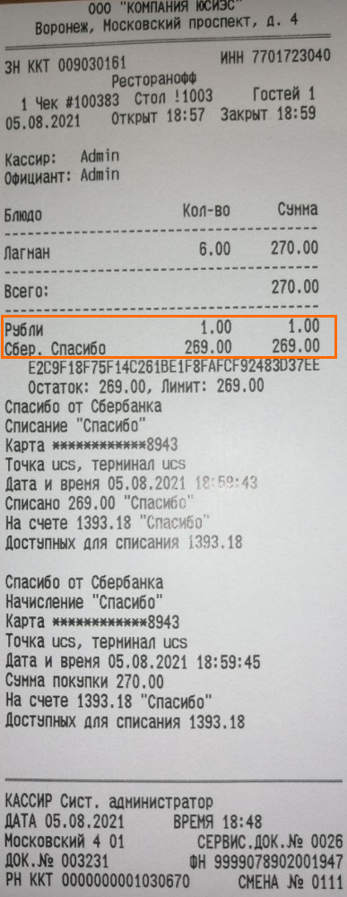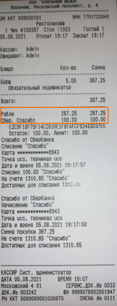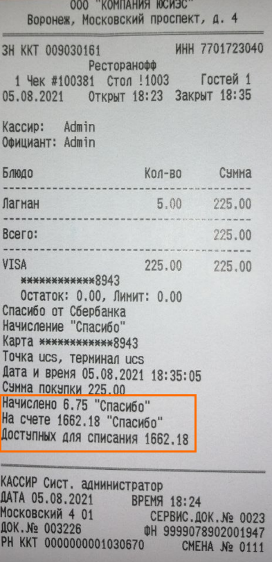 - После настроек печати чека вы увидите начисление баллов Спасибо, при печати