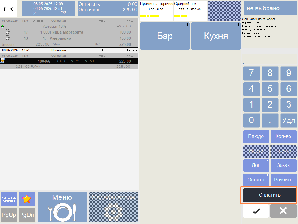 В момент печати чека на прием оплаты информация об оплате попадает только в фискальные отчеты. В отчеты r_k информация о продаже попадёт только после подтверждения реальной оплаты заказа и его закрытия.- Далее гость производит реальную оплату.