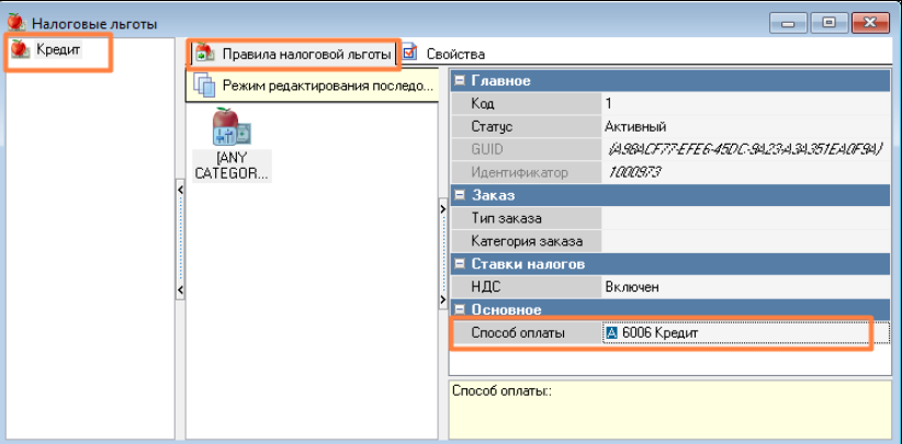 - в разделе Основное в свойстве Налоговая льгота выберите значение Кредит