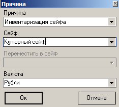 . В появившемся окне выберите причину Инвентаризация сейфа. Выберите также сейф и валюту. Выбрать можно только ту валюту, у которой в редакторе r_keeper_7 указаны номиналы. Нажмите кнопку [Ок] для перехода к следующему этапу создания документа, [Отмена] – для отказа от операции.