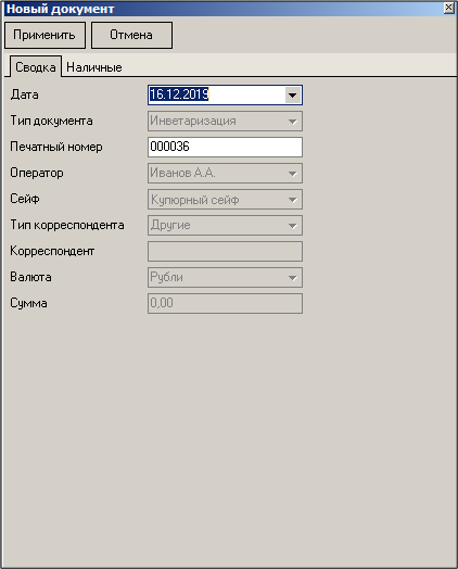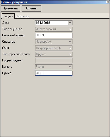 Если для создания документа был выбран некупюрный сейф, то закладка «Наличные» будет неактивна. Сумму документа укажите в нижней строке на закладке «Сводка».