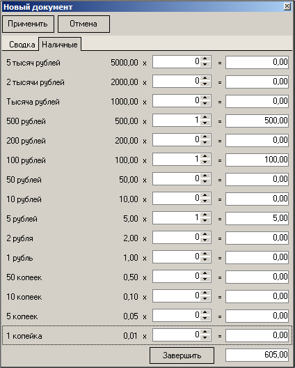 Если для документа выбран купюрный сейф, то будет доступна закладка «Наличные». Для таких документов выберите закладку «Наличные» и укажите количество каждой купюры в сейфе. В нижней строке окна «Наличные» ведется подсчет общей суммы документа. После заполнения закладки «Наличные» нажмите кнопку [Завершить] для перехода к закладке «Сводка».