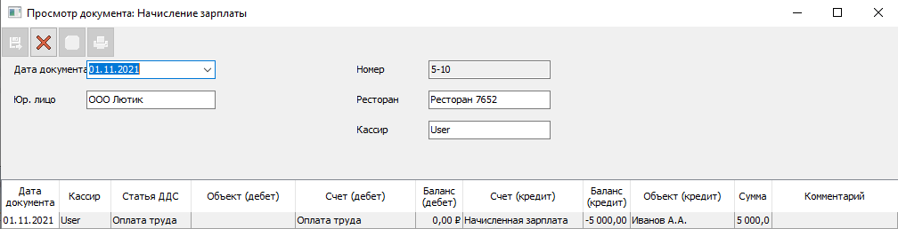 При проведении документа происходит формирование текущего долга по зарплате проводкой: Начисленная зарплата > Оплата труда.