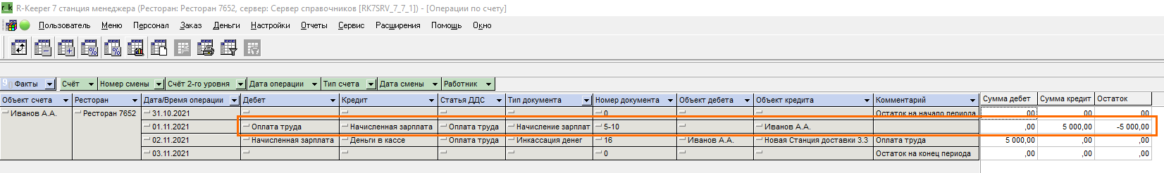 На этом этапе баланс счета Начисленная зарплата становится отрицательным.