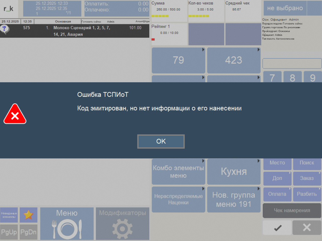 В случае, если при проверке марки вернулась ошибка из ТС ПИоТ, данная ошибка будет выведена на кассу. Марка к блюду добавлена не будет.