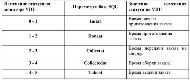 "Начало приготовления", "Окончание приготовления", "Забрано", "В сборке" и "Собрано" в таблице с информацией от VDU.