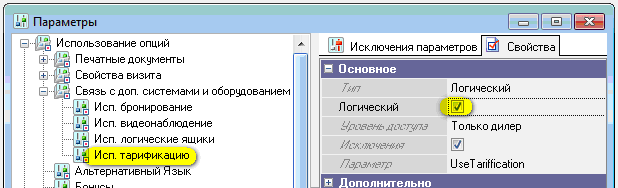 1.2. Если в свойствах блюд нет данных полей, необходимо в разделе «Настройки->Параметры->Использование опций->Связь с доп. системами и оборудованием->Исп. тарификацию» установить галочку в поле свойства «Логический».