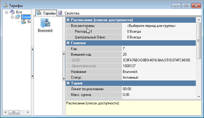 Добавить столько тарифицируемых устройств (Настройки -> Столы и залы -> Планы залов и столы -> вкладка Тарифицируемые устройства), сколько игровых дорожек в Брансвик (как настроить тарифицируемые устройства читайте в статье Настройка работы с боулингом AMF. В свойствах тарифицируемого устройства необходимо заполнить следующие поля: "номер дорожки"=номеру дорожки в Брансвике, "Тариф" - выбрать тариф (тариф должен быть с детализацией, справочник Меню -> Тарифы).