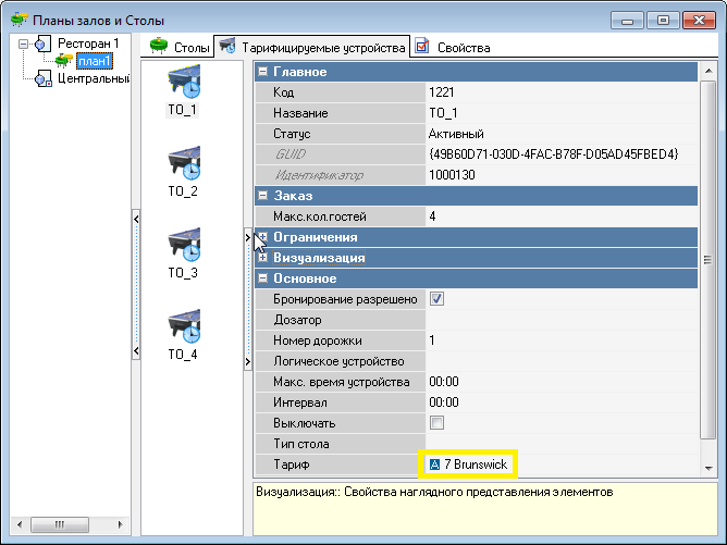 5. Добавить столько тарифицируемых устройств (Настройки -> Столы и залы -> Планы залов и столы -> вкладка Тарифицируемые устройства), сколько игровых дорожек в Брансвик (как настроить тарифицируемые устройства читайте в статье о настройке работы с боулингом AMF. В свойствах тарифицируемого устройства необходимо заполнить следующие поля: "номер дорожки"=номеру дорожки в Брансвике, "Тариф" - выбрать тариф (тариф должен быть с детализацией, справочник Меню -> Тарифы).