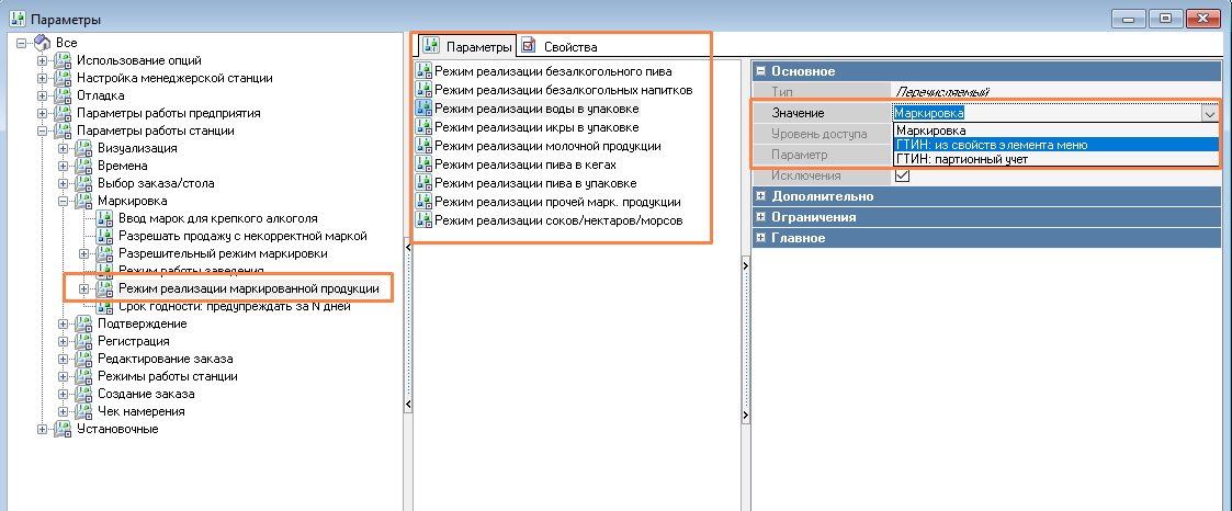 Группа параметров Режим реализации маркированной продукции. Для каждой категории в отдельном параметре выберите вариант работы: