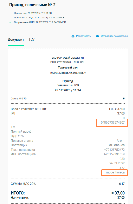 После смены настройки проверьте в ЛК ОФД, что чек с маркировкой уходит корректно — в чеке есть GTIN и есть запись mode=horeca