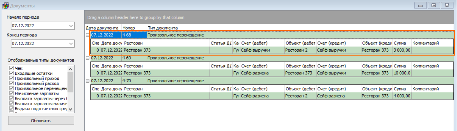 Готово, перемещение средств завершено. Теперь проведение документа отобразится в форме Документы