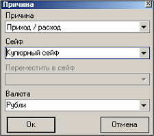 . В появившемся окне выберите причину Приход/расход. Выберите также сейф и валюту. Выбрать можно только ту валюту, у которой в редакторе r_keeper_7 указаны номиналы. Нажмите кнопку [Ок] для перехода к следующему этапу создания документа, [Отмена] – для отказа от операции.