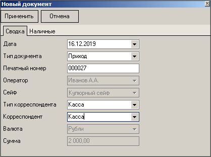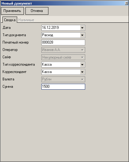 Если для создания документа был выбран некупюрный сейф, то закладка «Наличные» будет неактивна. Сумму документа укажите в нижней строке на закладке «Сводка».