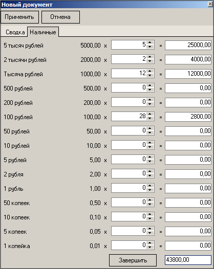 Если для документа выбран купюрный сейф, то будет доступна закладка «Наличные». Для таких документов выберите закладку «Наличные» и укажите количество каждой купюры в сейфе. В нижней строке окна «Наличные» ведется подсчет общей суммы документа. После заполнения закладки «Наличные» нажмите кнопку [Завершить] для перехода к закладке «Сводка».