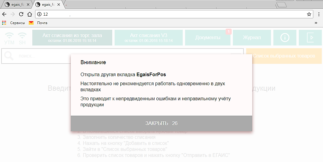 Внимание! Если открыто несколько вкладок EgaisForPos, то будет выдано предупреждение: