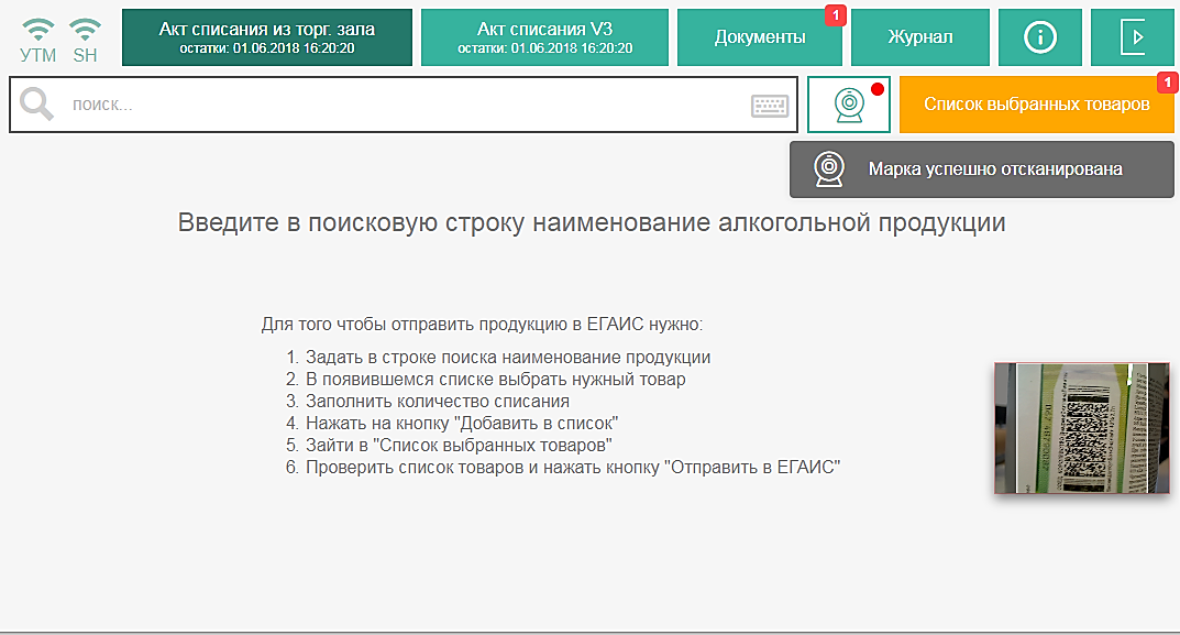 убрана из интерфейса. Сканировать марку товара можно как в окне «Поиск товара», так и в окне «Список выбранных товаров».