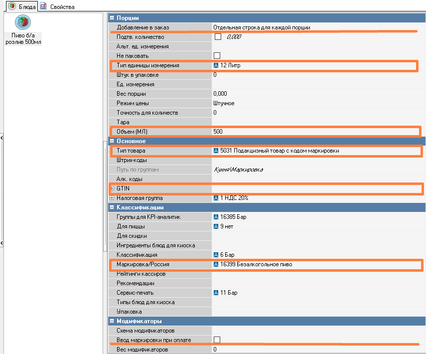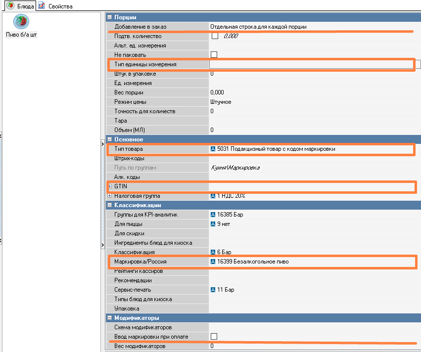 Для реализации Безалкогольного пива, как маркированного товара, в справочнике Меню > Меню для блюда сделайте следующие настройки: