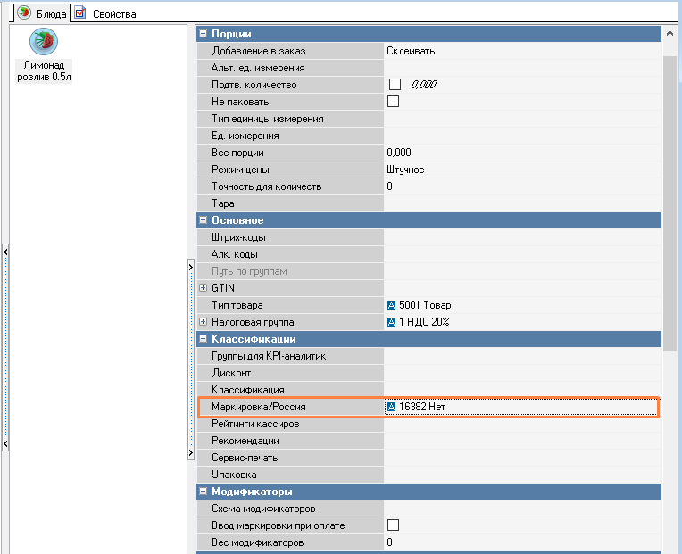 При продаже в розлив этих категорий передача в чеке кода идентификации (марки) или кода товара (GTIN) не требуется. Поэтому дополнительных настроек для блюд, описанных в статье Реализация маркированных напитков в упаковке (вода и сахаросодержащие напитки), делать при продаже в розлив НЕ НАДО!